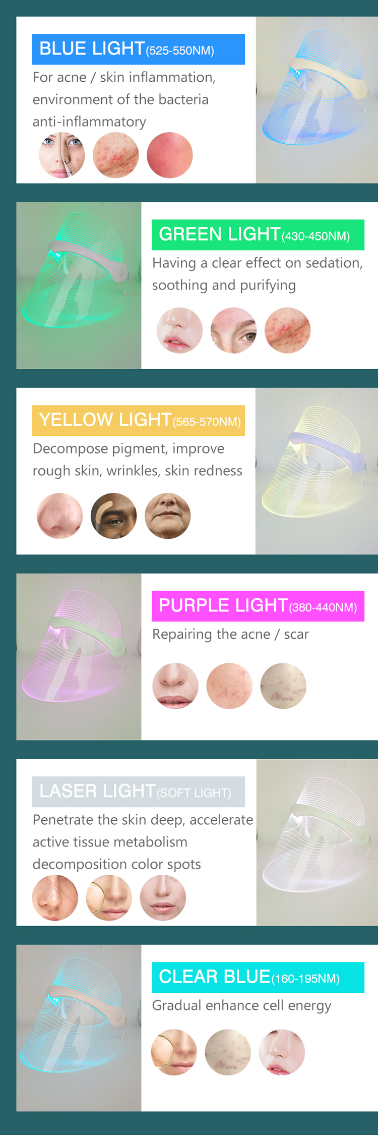 1. يمكن لقناع 7 ألوان LED حل مشاكل الجلد المستعصية ، مثل علاج حب الشباب وإصلاح ندبة حب الشباب. 7 مصادر إضاءة ملونة مختلفة لتلبية الاحتياجات المختلفة.