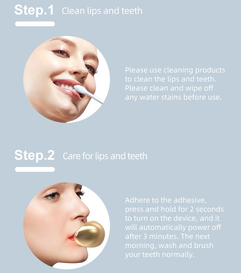 Step.2 Care for lips and teeth Adhere to the adhesive,press and hold for 2 secondsto turn on the device, and itwill automatically power offafter 3 minutes. The nextmorning, wash and brushyour teeth normally.