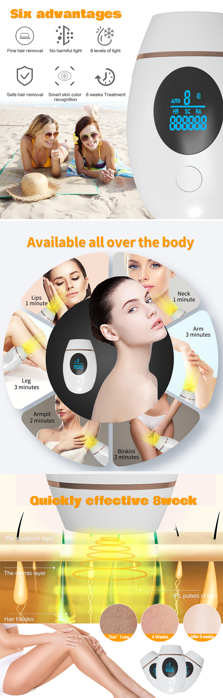 5. 8 intensità regolabili possono rilasciare energia diversa in base alle diverse pelli, quindi può ottenere meglio l'effetto della depilazione senza danneggiare la pelle.