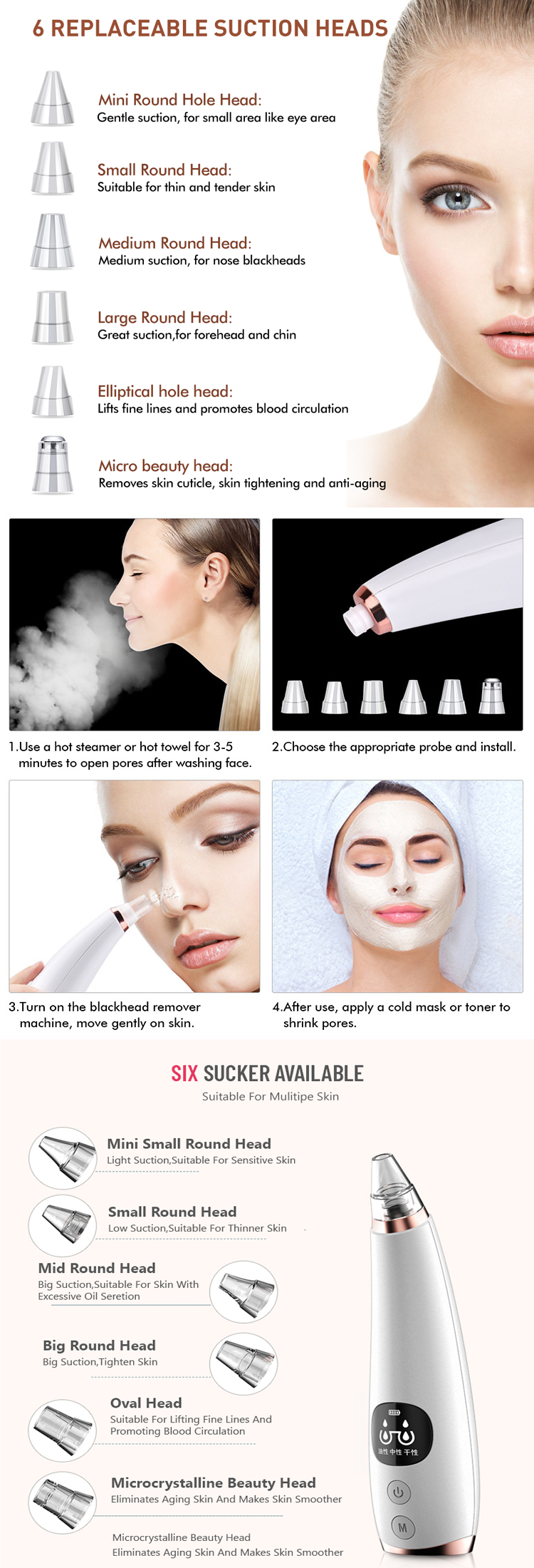 6. Упаковано с 6 различными головками для решения всех ваших задач, удаления черных точек, жира, косметических остатков, прыщей, морщин с разных частей лица, а также эффективно для микродермабразии, повышения жизнеспособности кожи, помощи в очистке пор и придания коже гладкости и подтяжки. .