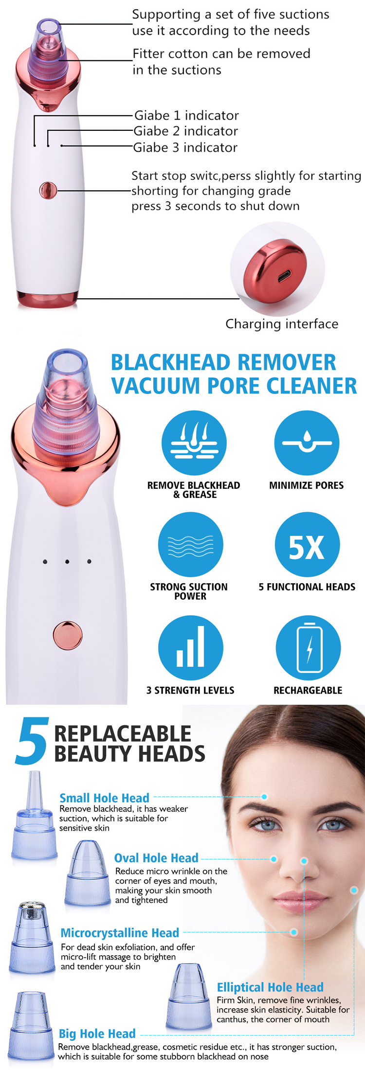 6. 5 сменных всасывающих головок, поставляется с 5 всасывающими головками для решения различных проблем с кожей.